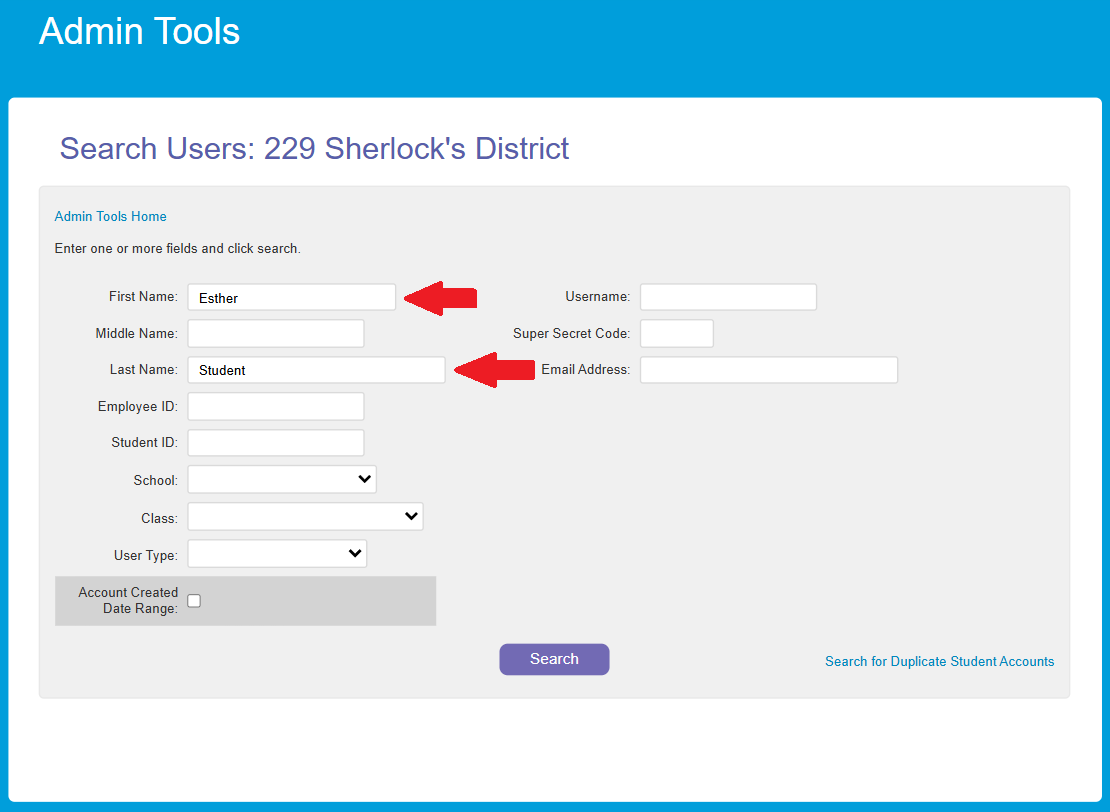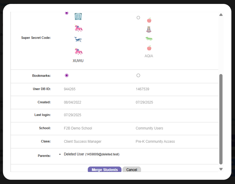 If you find that a student has two Super Secret Codes or you discover a Community User student that has a student account, you can easily merge the two accounts.
