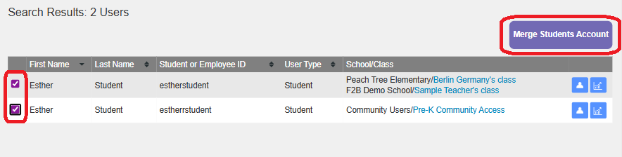 5. Click the checkbox next to the two accounts that you would like to merge and select Merge Students Account: