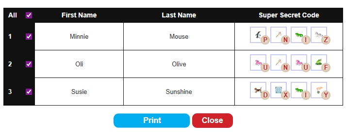This is a student login card. These cards provide an easy reference for students to learn their Super Secret Codes. Here's how to print them out.