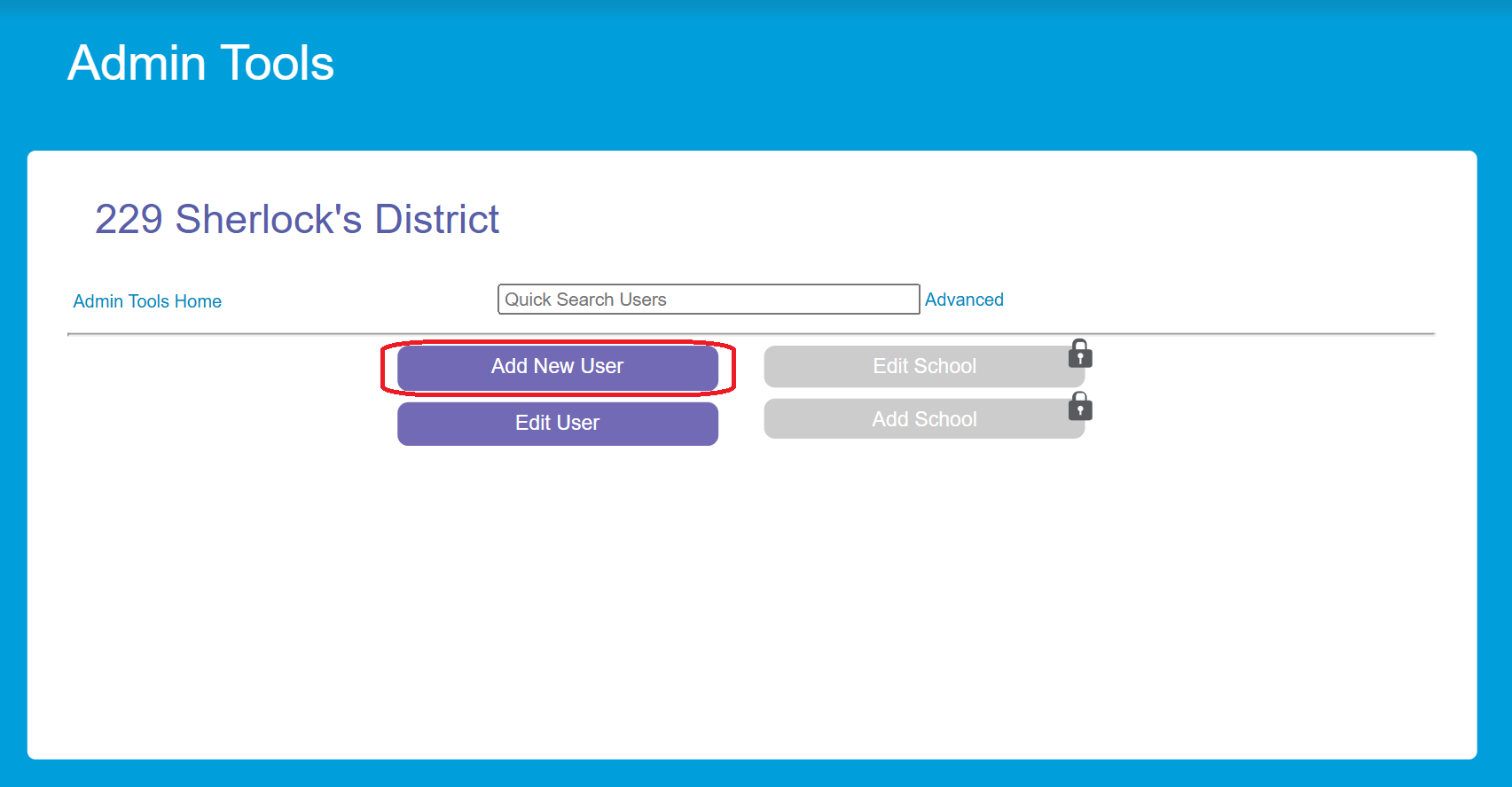You can add a new teacher to your district by clicking the Home button in the upper left corner of your screen and selecting Admin Tools.