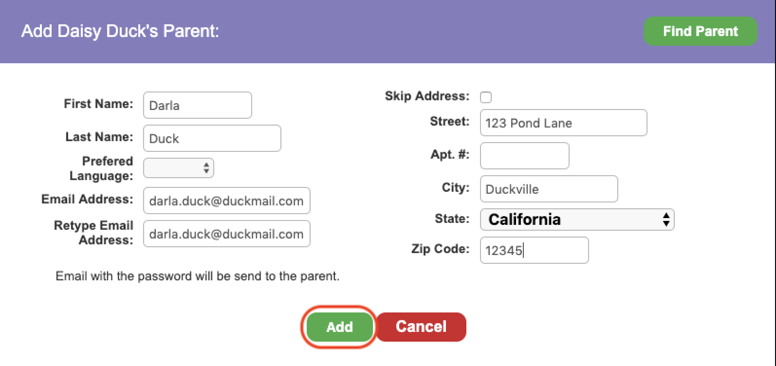 5. Enter the parent information and click Add.