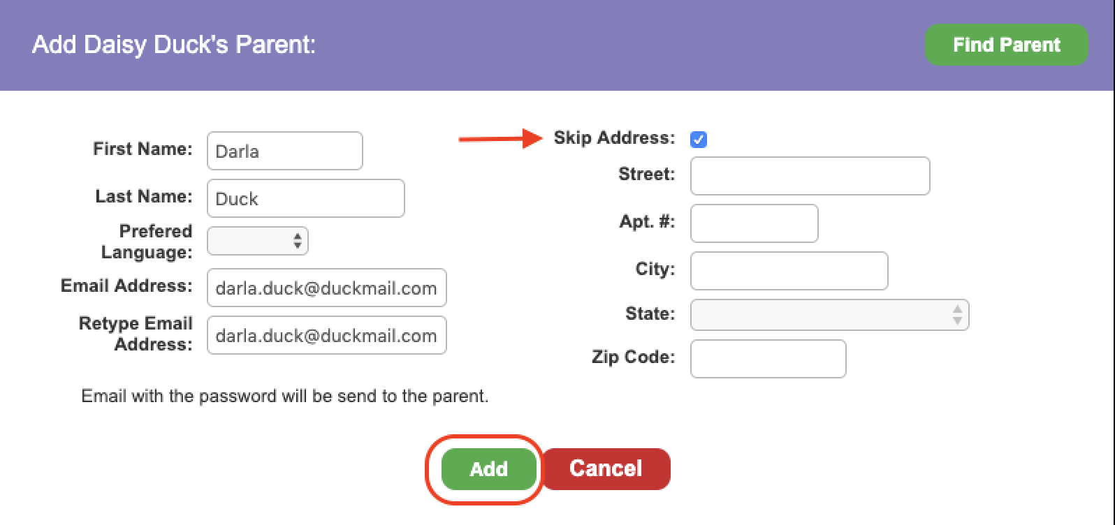 *If you do not have the parent's address, you can check the Skip Address box and then click Add.