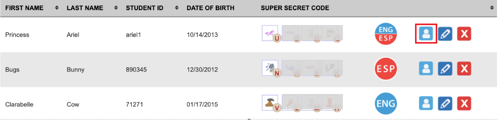 Students' current language toggle settings are displayed in the student list. Click the Student Profile button to update the language toggle settings.