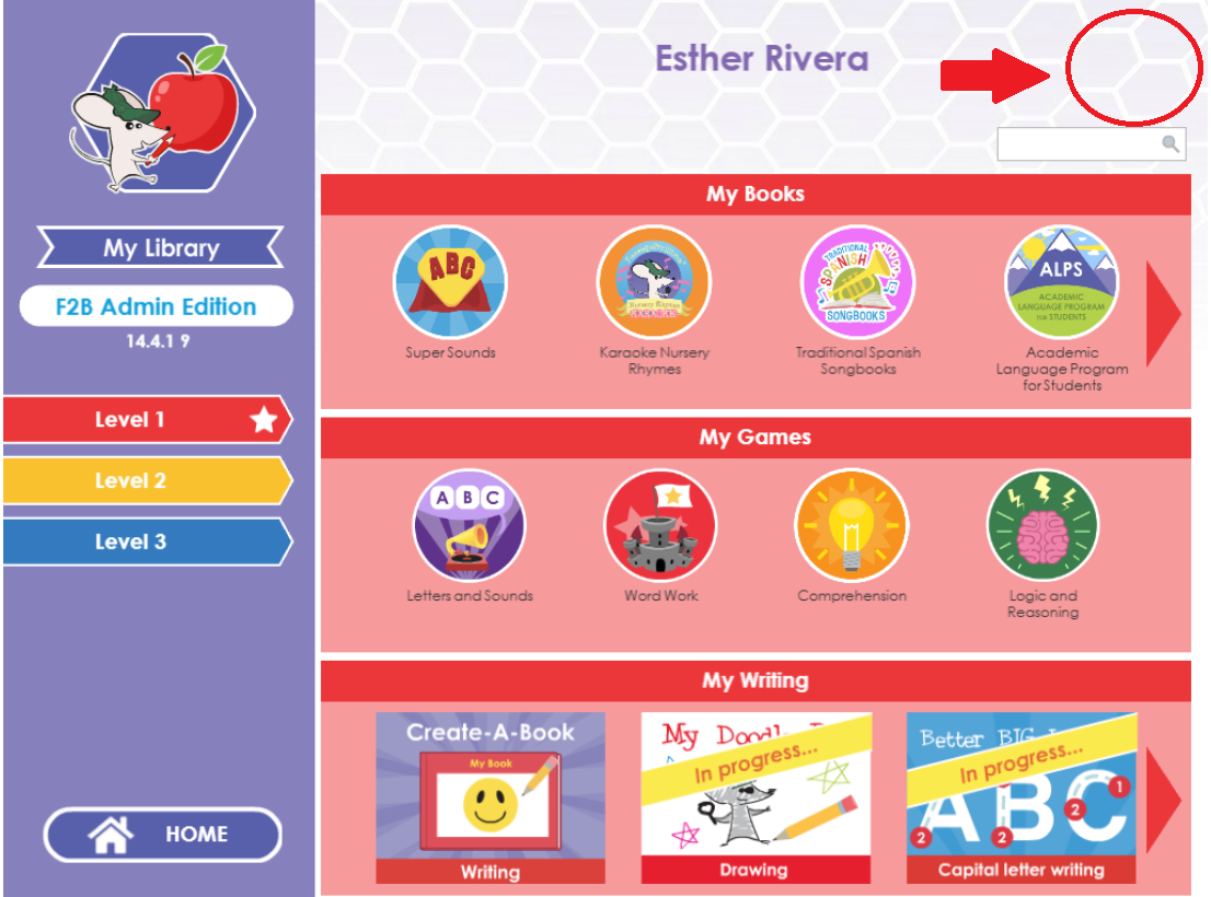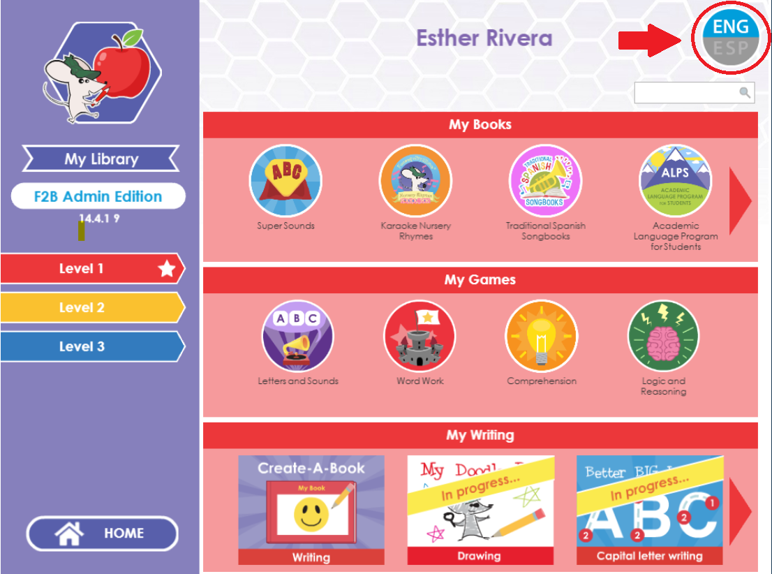 Teachers and administrators can manage students' language settings in Class Management. By default, most screens in My Library, Pre-Reader, and I Can Read include an English–Spanish toggle button. These settings can be changed to show English only, Spanish only, or both.